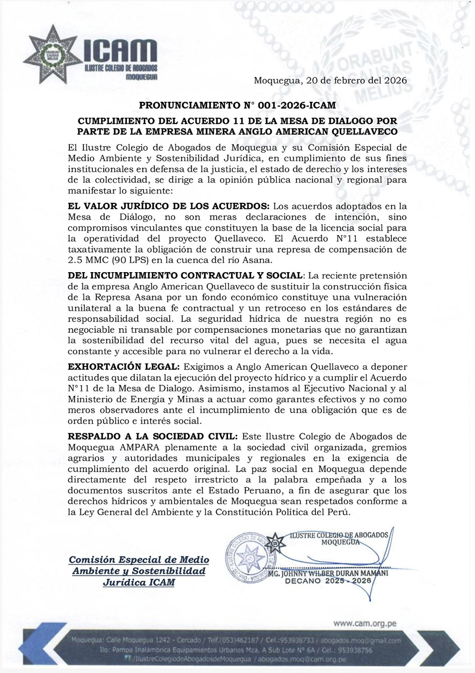 El Ilustre Colegio de Abogados de Moquegua se pronuncia sobre el incumplimiento del Acuerdo Número 11 de la Mesa de Diálogo por parte de Anglo American Quellaveco.
