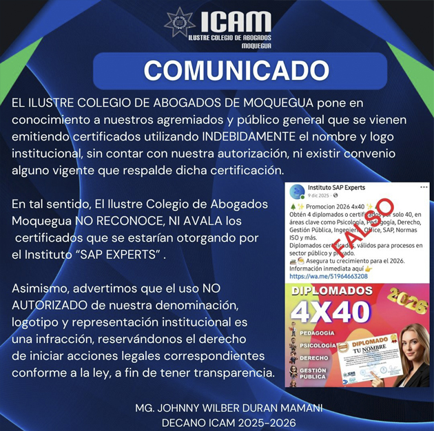 En tal sentido, El Ilustre Colegio de Abogados Moquegua NO RECONOCE, NI AVALA los certificados que se estarían otorgando por el Instituto SAP EXPERTS.